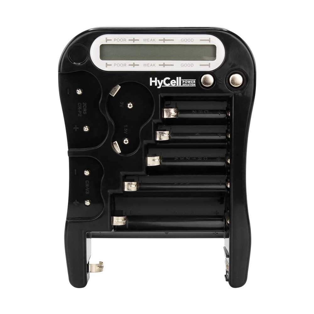 Praktisk og brugervenlig batteritester med stor LC-skærm. Til AAA, AA, C, D, 9 V, Lady N (LR1), CR123A, CR2, CR-V3, 2CR5, CR-P2 samt knapceller osv. Batteritilstandsvisning i tre display-områder med 18 bjælker. Virker til mere end 12 forskellige batterityper.