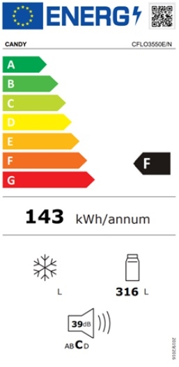 Lækkert CFLO3550EN køleskab fra Candy på 316 liter. Skabet indeholder 5 hylder, 1 skuffe, 5 dørhylder og en æggebakke.