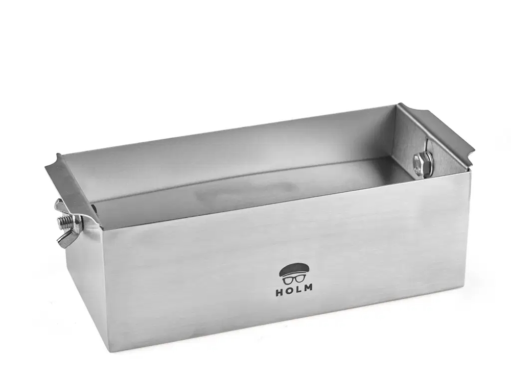 Solid rullepølsepresse med låg, der presses ned over rullepølsen med praktiske vingeskruer.