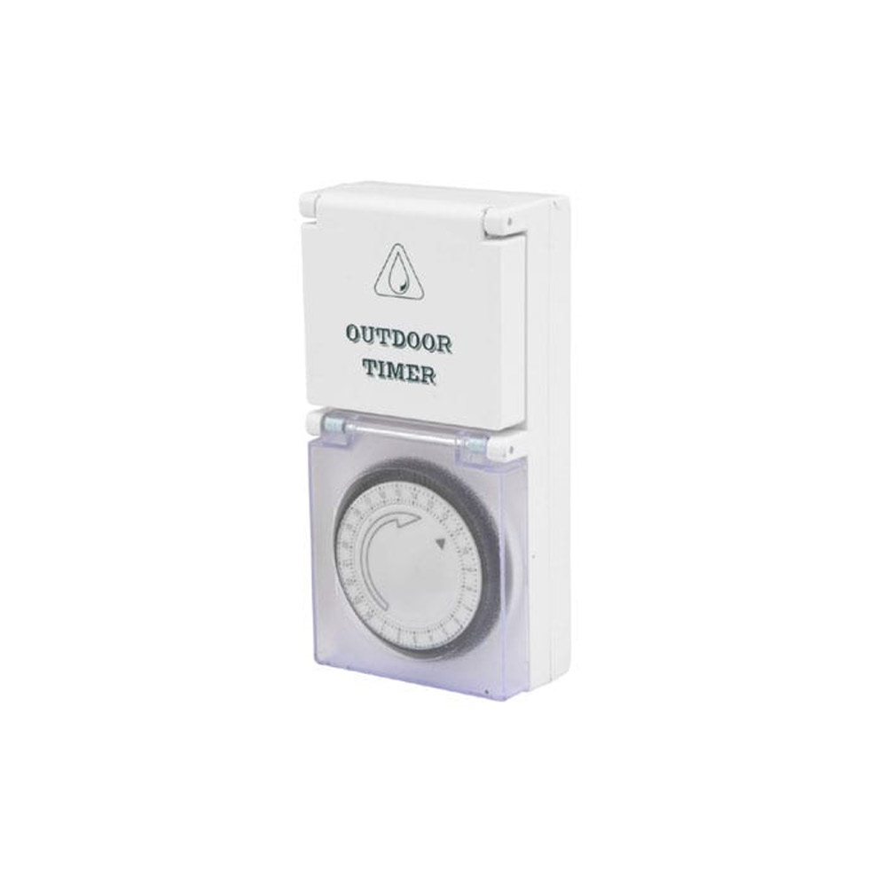 Dette mekaniske døgn-ur gør det muligt at tænde og slukke for din udendørsbelysning indenfor et valgt tidsinterval. Døgnuret er egnet til udendørsbrug og kan blandt andet anvendes til at slukke for udendørslamper og -lyskæder. Døgnuret har drejeskive, som gør det nemt at justere tidsintervallet.