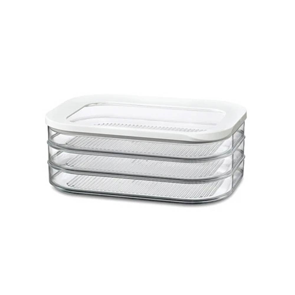 Modula opbevaringsboks med enkel, hvid kant på låget. Både bokse og låg er gennemsigtige, hvilket gør det nemt at overskue indholdet. 3 x 550 ml. Mål: 22,5 x 16 x 8 cm. Boksene er fremstillet af SAN-plast, som er robust og modstandsdygtig overfor ridser. Velegnet til opvaskemaskine men ikke til mikroovn og fryser.