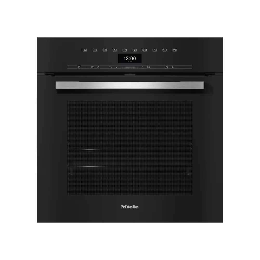 Lækker Miele ovn i elegant, sort design med funktioner som stegetermometer, pyrolyse og wi-fi.