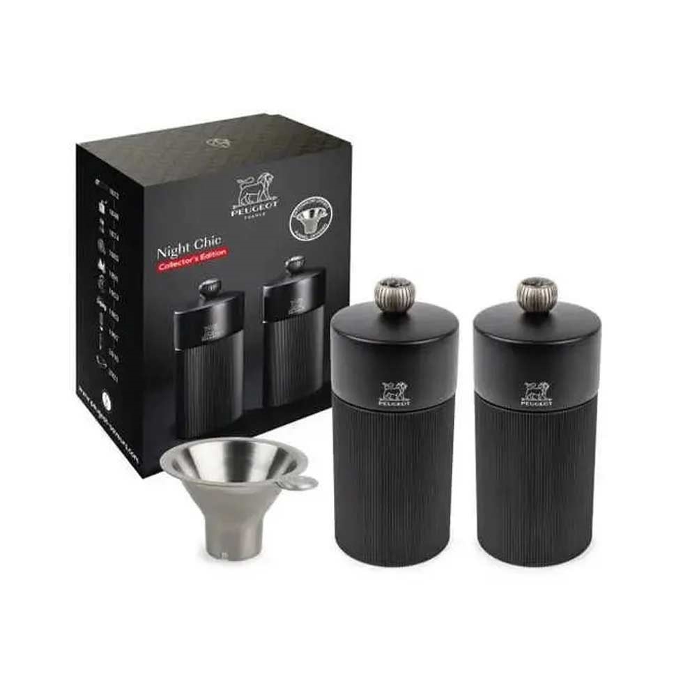 Kværnsættet kombinerer moderne æstetik med klassisk håndkværnsfunktion. Med en højde på blot 12 cm og den elegante matsorte finish er sættet både diskret og raffineret – ideelt til det moderne spisebord eller den stilfulde køkkenreol. Kværnene er fremstillet med Peugeots anerkendte kværnværk i stål, der er specielt designet til henholdsvis salt og peber.