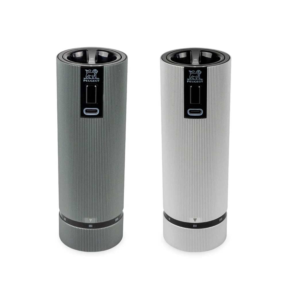 Dette stilrene duo sæt af salt-og peberkværn er fremstillet i aluminium med smalle, lodrette riller. Farvevalget på kværnene gør det nemt at skelne mellem peber og salt – den mørke farve til peber og den lyse til salt. Sættet har indbygget et genopladeligt Lithium-ion batteri som har lang batterilevetid og kort opladningstid. Opladerkabel medfølger.
