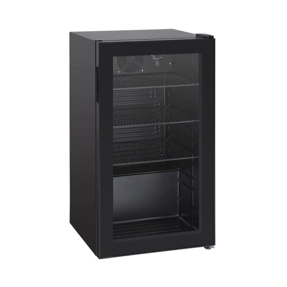 DC98BB er et 1-dørs  sort displaykøleskab med 88 nettoliter køleplads. Leveres med 3+1 sorte trådhylder, som er justerbar og dermed sikrer, at alle typer glas, dåser og flasker kan passe ind i skabet og stå stabilt på hylderne. Hylderne har en maksimal kapacitet på 26 kg. Skabet har 2 justerbare fødder i front, så det står stabilt på alle overflader. Skabet har en hængslet dør, der er hængslet i højre side. 1 horisontalt energibesparende LED-lys i fronten giver et godt lys og præsenterer varerne pænt.
